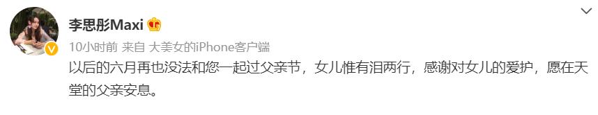 李诗颖还发了一条动态送别父亲,以后再也没法和您一起过父亲节,感谢对女儿的爱护,愿天堂的父亲安息,从李诗颖的文字中,能够感受到父女俩的感情很深厚,父亲的离去对她的打击也很大,但她还要坚强为父亲操办后事。
