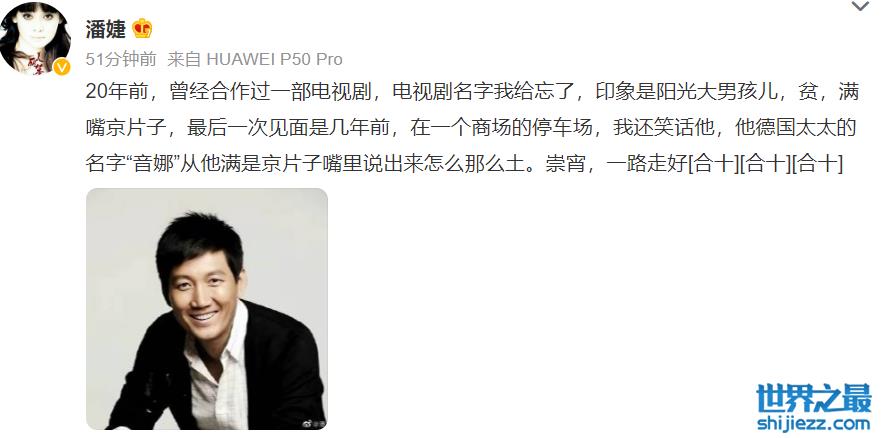 演员潘婕也发文悼念李崇霄,可以看出私下两人虽然不经常见面,但李崇霄阳光大男孩的形象给她留下了深刻印象,她说李崇霄满嘴京片儿,还很耍贫,两人最后一次见面是几年前,在一个商场的停车场,潘婕还笑话他,说他用京片儿嘴里说出来太太的名字“音娜”怎么那么土,回忆过往,潘婕也是不舍他就这么离去了。