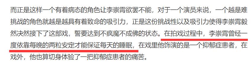 在2014年李崇霄拍摄电视剧《憨妻》时,饰演的周斯伟就是一个有着抑郁症的大学教授,李崇霄拍摄这部戏时,因为角色的带入每天需靠吃药才能入睡,当时他在接受采访时就透露,险些成为抑郁症患者,他还呼吁大家要多陪陪家人,不知道是不是从那个时候李崇霄的状态就不对了,他患抑郁症也已经很长时间了。