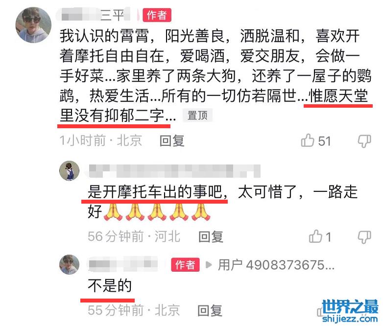 在评论区,有网友询问李崇霄去世是不是因为骑摩托车发生意外所致,好友回应说不是的,而后又发文透露“她认识的霄霄阳光善良,洒脱温和,喜欢开着摩托自由自在,爱喝酒,爱交朋友,会做一手好菜,家里养了两条大狗,还养了一屋子的鹦鹉,热爱生活,所有的一切仿若隔世,惟愿天堂里没有抑郁二字。”