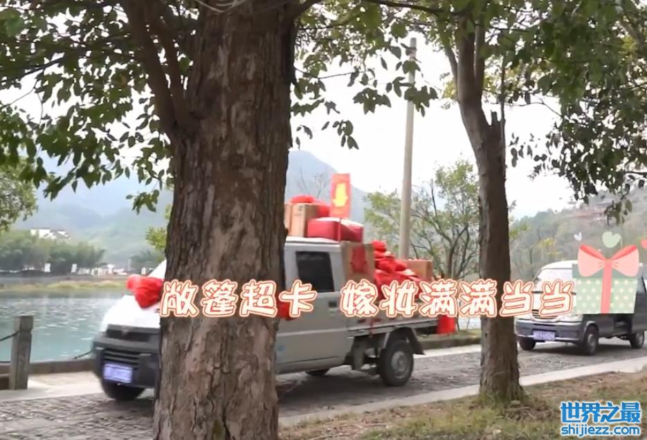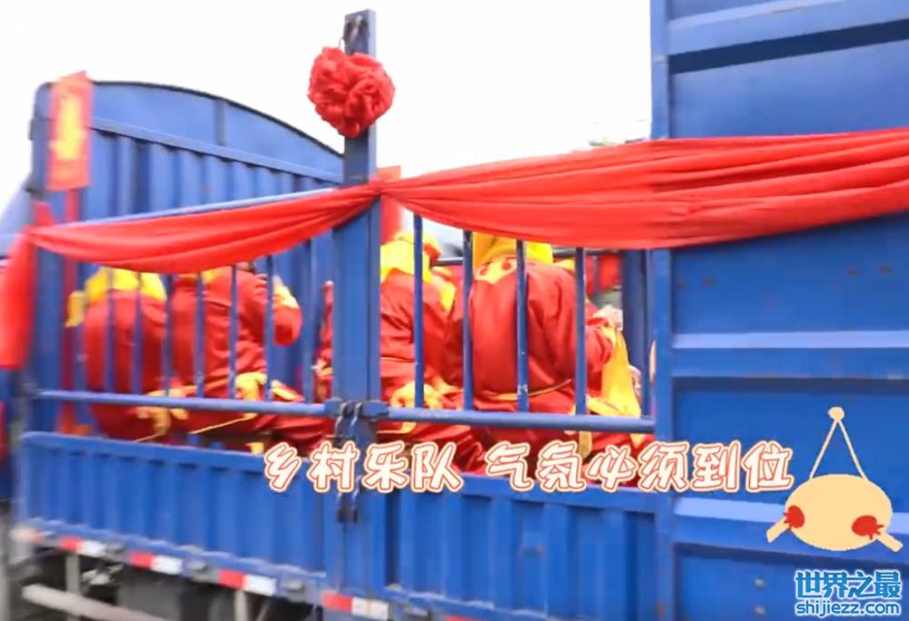 后面还跟着一车“乡村乐队”,吹唢呐的、打镲的,车开一路乐队就吹一路,喜庆的气氛直接拉满。