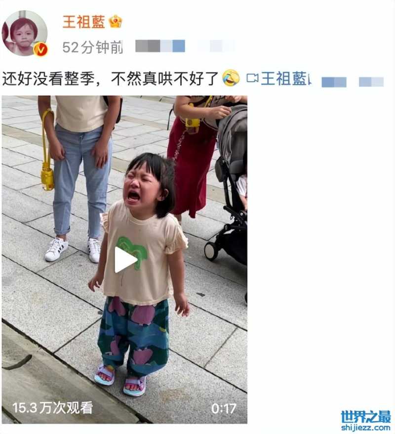 近日,王祖蓝晒出一段女儿gabby当街嚎啕大哭的视频,配文说“还好没有看一整季,不然真哄不好了。”
