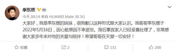 季东燃妹妹通过登录哥哥的账号,亲自发文:大家好,我是季东燃的妹妹,很抱歉以这种形式跟大家认识。我哥哥季东燃于2022年5月16日,因心脏原因不幸逝世。身后事宜家人已经妥善处理了,非常感谢大家多年来对他的关爱与陪伴!希望哥哥在天堂一切安好!