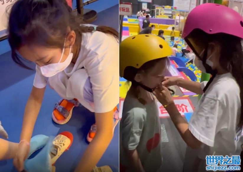 当天还有一位小妹妹跟甜馨一起玩耍,在进游乐场之前,甜馨还蹲下来贴心地帮小妹妹换袜子。玩游乐项目时,甜馨还帮妹妹穿戴头盔,显得十分懂事。
