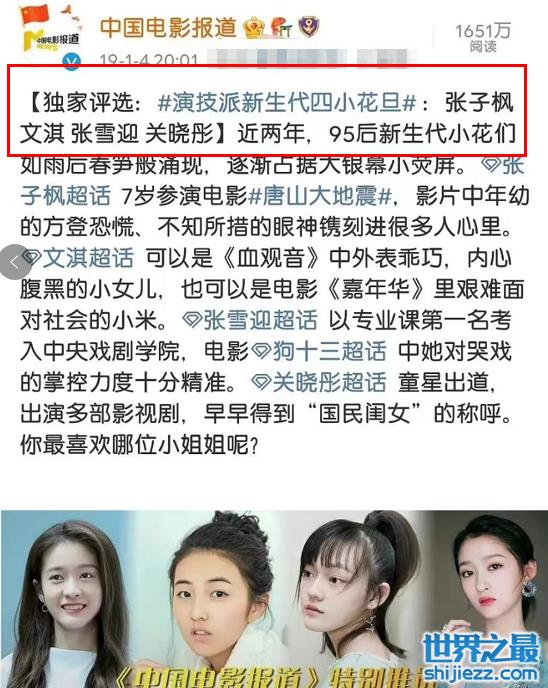 2019年,人称央视“六公主”的电影频道评选出了“演技派新生代四小花旦”,分别是张子枫、文淇、张雪迎和关晓彤。