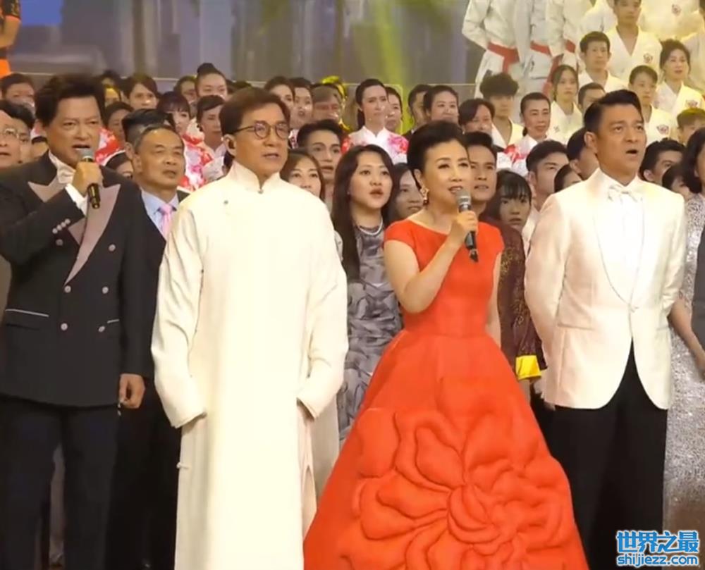 在当晚的晚会中,刘德华还与成龙率领群星在香港红馆合唱了一首《歌唱祖国》,画面很是宏大,众星也唱得激情澎湃,展现出了一副积极爱国的模样,成龙大哥在晚会上也独唱了一首《中华力量》,完美地演绎了我为国强,国为我强这个概念。