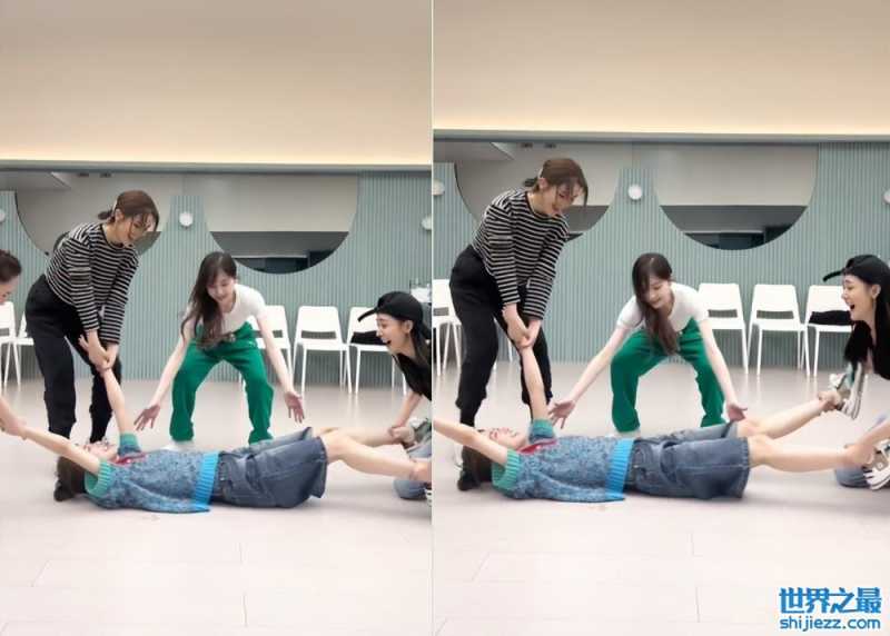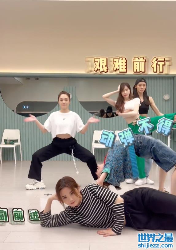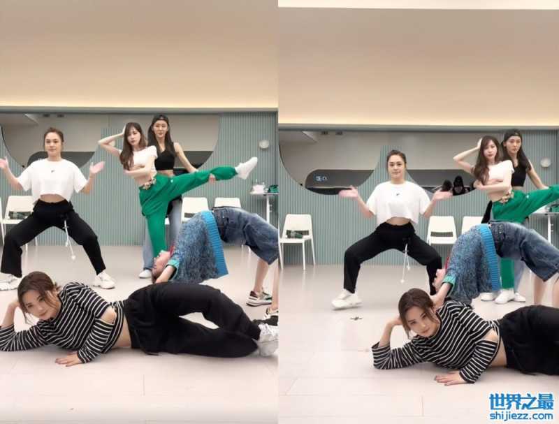 视频中,王心凌单手拖头高抬腿,张天爱在她身后用手托举着,阿sa则完全趴在地上表情一脸严肃,阿娇更是直接张开双手屈膝学着螃蟹走路,众人千奇百怪的姿势画面搞笑十足。