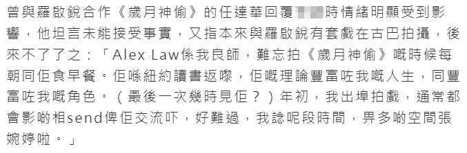 在得知罗启锐去世的消息后,任达华接受媒体了采访,他坦言未能接受事实,又指本来与罗启锐约好了要在古巴拍摄,后来不了了之,他难忘拍《岁月神偷》的时候一起同早餐,两人年初的时候还见了面,私下也都会互相交流。