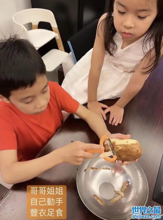 霍启刚和小女儿把马铃薯买回来后,8岁的大儿子霍中曦和二女儿霍中妍就开始负责动手做薯条。霍中曦自力更生削土豆皮,只见霍中曦拿着刨花神情专注地削土豆,旁边桌子上坐着二女儿霍中妍认真盯着哥哥削土豆片。