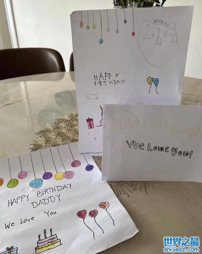 孩子们为爸爸准备了各种各样的生日贺卡,全都是自己亲手手绘完成的,上面画满了各种各样的爱心小彩球,还写上了“happy birthday”以及“we love you”,虽然涂鸦歪歪扭扭的,但是可以看出孩子们的满满心意,非常具有纪念意义,相信霍启刚看到这份礼物也是非常欣慰。