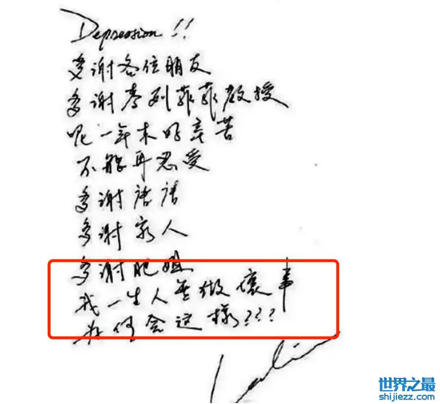 张国荣的抑郁症持续了很多年,只是他一直没有公开,2002年他就尝试过自杀,然后被救回。他在遗书中写到:我一生没做过坏事,为何会这样?