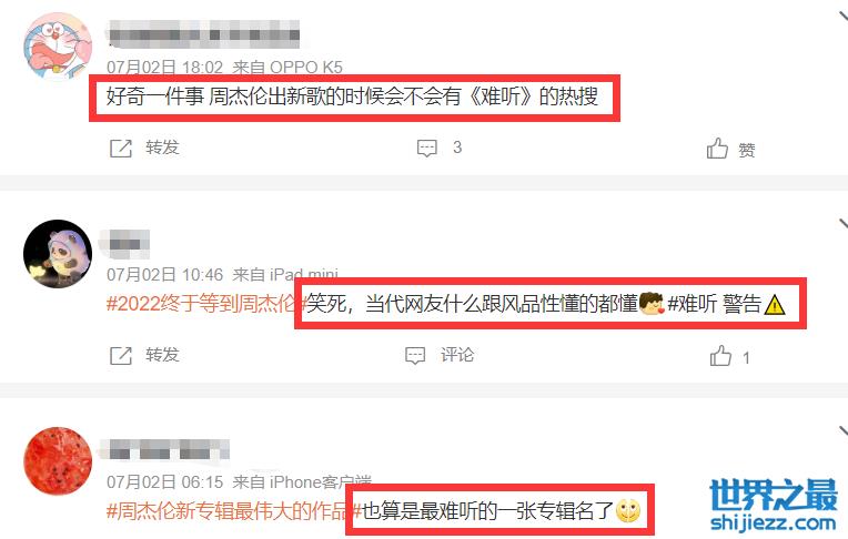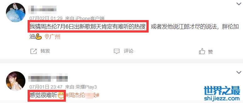 像周杰伦如今的地位,新歌发行不管好的评价还是坏的评价他肯定都能接受,但这种还没听歌就故意打一星就有些过分了,而且在周杰伦7月2日发行先导片后,不少黑粉更是在“难听”的话题下刷周杰伦的名字,粉丝现在都能猜测到周杰伦新歌出来的那天肯定有难听的热搜,或者说他江郎才尽。