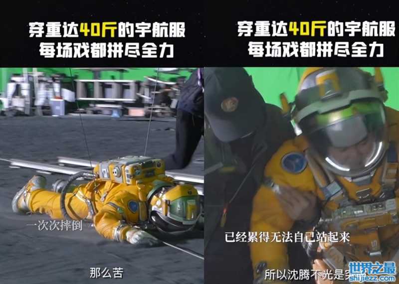 在视频中,沈腾在拍摄现场闷热的环境中,需要穿着重达40斤的宇航员戏服。虽然穿上去看起来风范十足,但他需要背负着这样的重量,一次次被威亚托在地上爬行,这样的动作难度,可想而知。