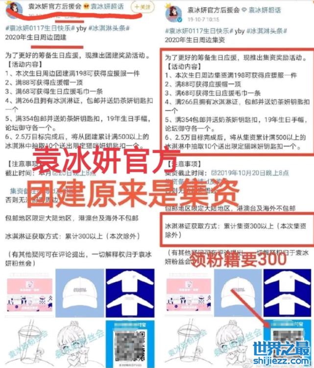 一场生日会下来,粉丝便募集到45万元的巨款,当时袁冰妍的官方后援会还发布过有关粉丝集资的动态,还推出了满额奖励机制,有应援服、帽子、毛巾等物品,其中领到粉籍需要交满300元。