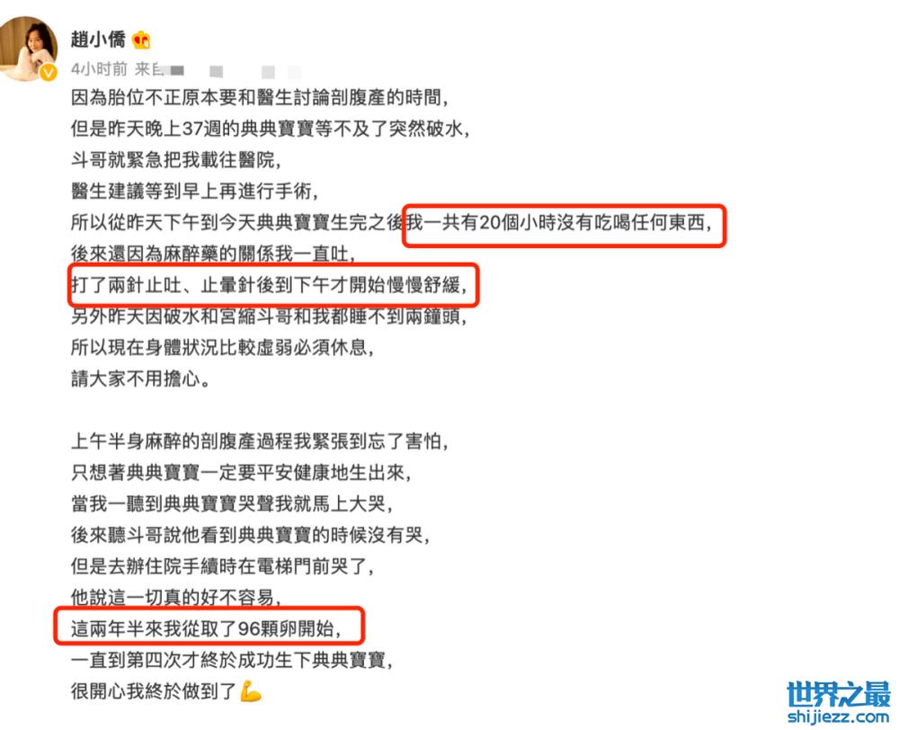 关于这次生产,赵小侨更是发了一篇长文讲述了生产不易。从昨天下午到典典出生,赵小侨一共20个小时没有吃东西,在打完麻药之后更是因为后遗症一直吐,打了两针止吐针才慢慢舒缓,身体也是非常虚弱,真的太辛苦了。