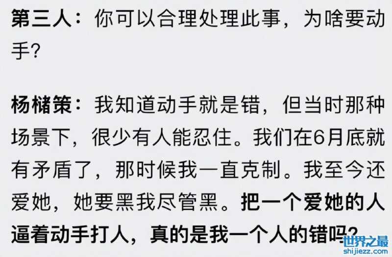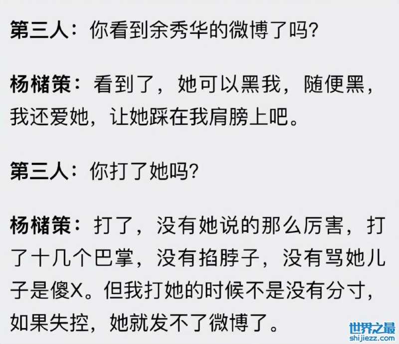 你打她了吗?杨槠策被问到的时候也毫不遮掩地表示自己的确是动手打了,但没有所谓的那么厉害,自己的确是打了十几个巴掌,但没有掐她的脖子,没有骂她的儿子是X儿,我有分寸,如果失控的话她也发不了微博。