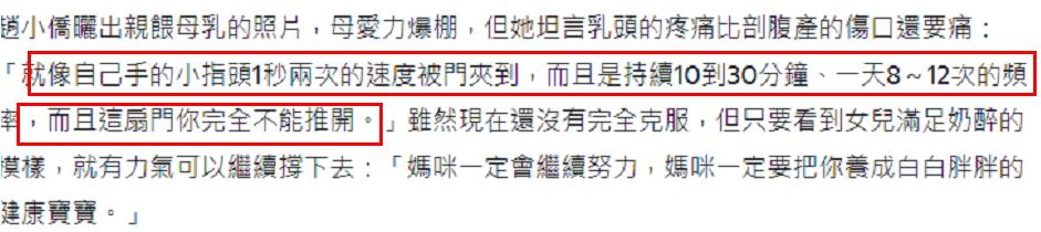 根据赵小侨的自述,现在给女儿哺乳时的疼痛要大于剖腹产带来的疼痛,像是连续不断地被门夹着。