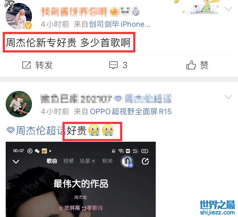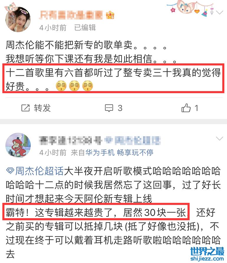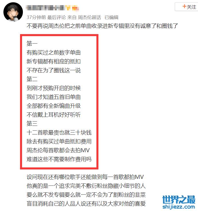 当然,更多的粉丝是可以接受30元的价格,觉得周杰伦的作品值这个价,更有粉丝表示虽然其中的5首是旧歌,但都全部重新制作了,更加精致动人,而且周杰伦的每首歌都拍了MV,制作的费用也高,大家能够感受到周杰伦的用心与诚意。