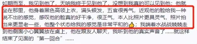 这位网友详细地描述了她与周润发见面的四个回合,并且感叹发哥本人比照片上更好看,更显精神,并且赞叹发哥状态平和,五官秀气。言语间可以看出网友的激动心情。