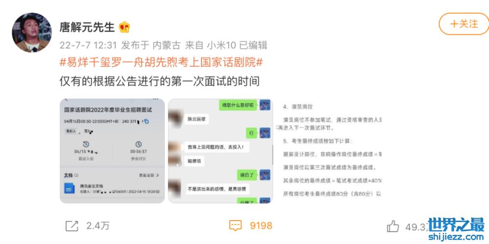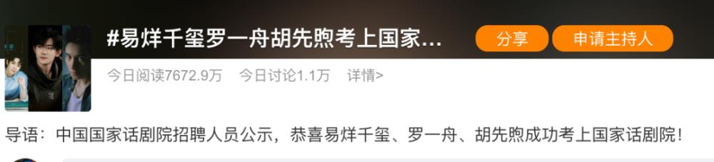 易烊千玺的事,先简单为大家梳理一下。起因是,7月6日有一条#易烊千玺罗一舟胡先煦考上国家话剧院#的话题上了热搜。