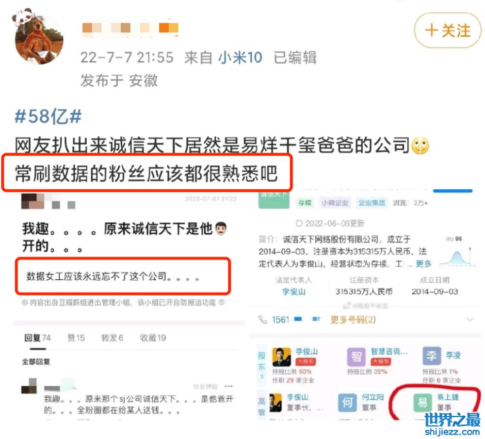 易烊千玺的父亲与他人合伙开公司,其中一家注册金额高达58亿,其中实缴金额5000万。要知道,一般明星开工作室,都是十万注册资金,高一点会过百万。