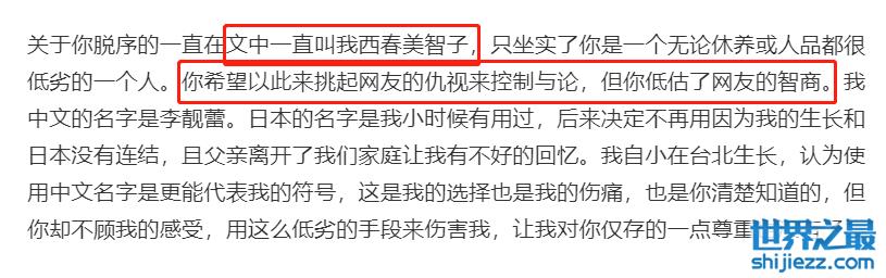 除了喊李靓蕾的日本名字外,王力宏在发声里还将自己曾经的老婆塑造为一个“疯女人”,以将自己放置在弱势的位置上。