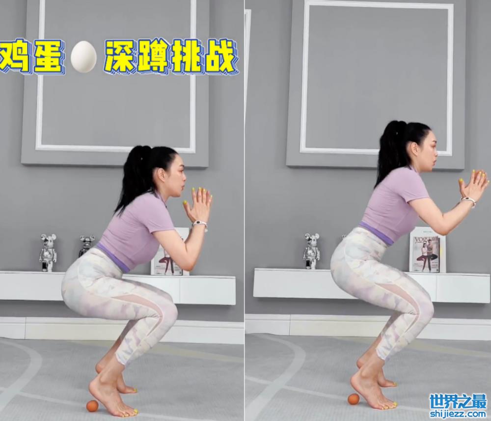 视频中钟丽缇正在进行鸡蛋深蹲挑战,这个挑战就是将两个鸡蛋放在脚底板,然后踮起脚尖,不能碰到鸡蛋,然后深蹲,刚开始钟丽缇也有些保持不住平衡,差点就踩上了鸡蛋,多亏了一旁的健身助手帮忙才没有踩上去。