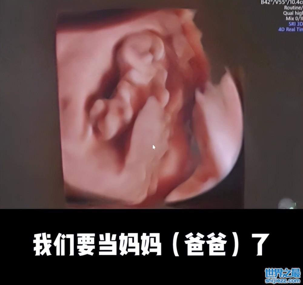 在视频中周娇与她的老公一同出镜,两个人脸上洋溢着兴奋的笑容,一同喊出“我要当妈妈(爸爸)了,随后晒出了b超检查的图片。