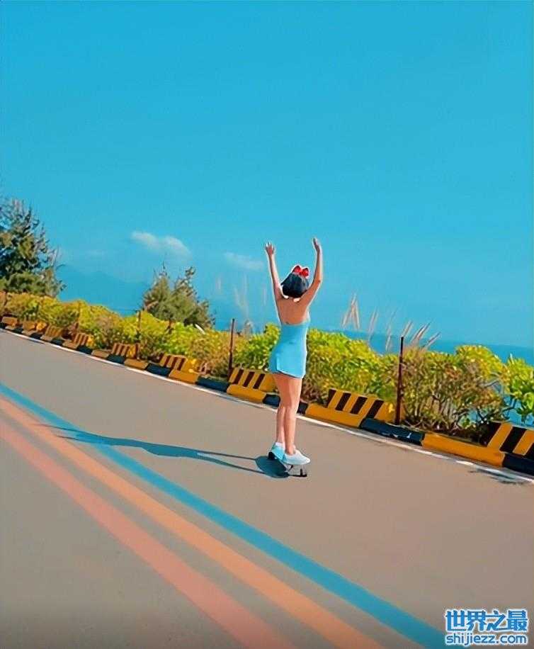 赵奕欢身上的蓝色吊带小短裙随风飘曳,头上的红色蝴蝶结夸张又张扬,站在滑板上滑行的赵奕欢帅气又活泼,碧海蓝天、青葱矮树,赵奕欢的出现同样成为马路上一道靓丽的风景线。
