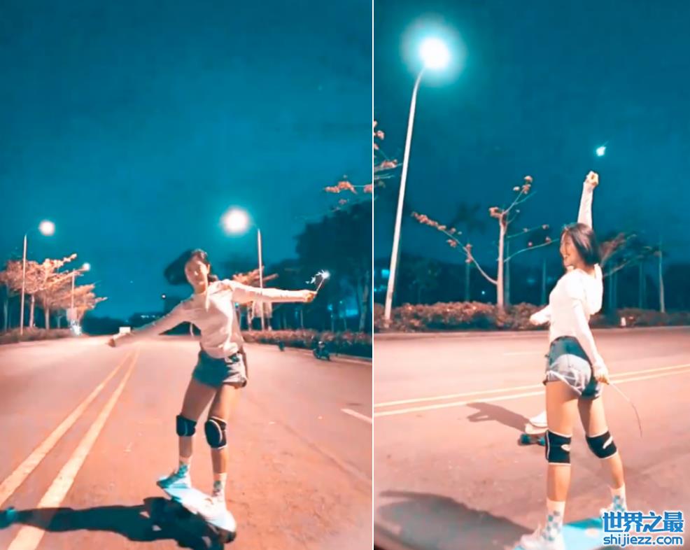 赵奕欢的手里拿着两个烟花棒,一边滑板一边挥舞手上的烟花棒,烟花在黑夜中熠熠生辉,划出好看的光亮,赵奕欢这样俏皮可爱的样子非常动人。