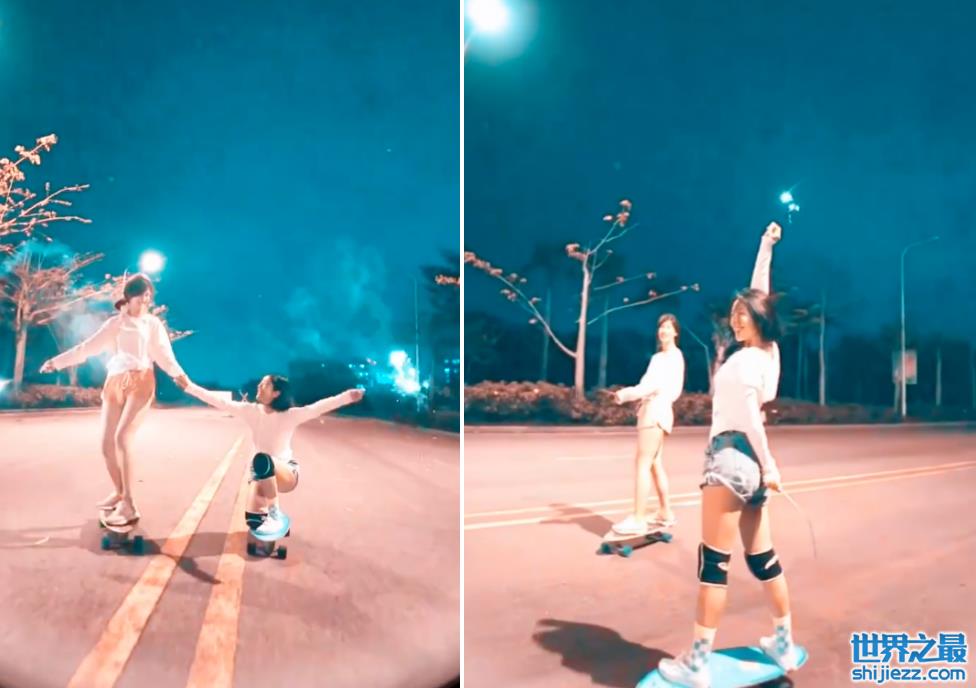 值得一提的是,赵奕欢并不是一个人去滑板,毕竟一个女孩子深夜在路上滑板,或多或少要注意一下安全问题。视频中赵奕欢和她的妹妹在一起,两个人关系相当亲密,赵奕欢蹲在滑板上牵着她妹妹的手,姐妹两个身材都相当吸睛,一双大长腿又细又直。