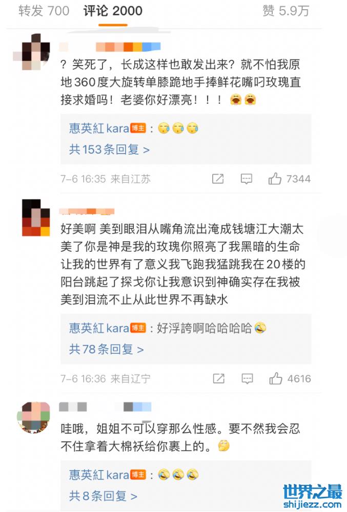 照片放出来之后网友们的反映也是非常热烈,一个个在评论区对惠英红发起了土味情话攻击,“美到眼泪从嘴角流出淹成钱塘江大潮”“就不怕我原地360度大旋转单膝跪地手捧鲜花嘴叼玫瑰直接求婚吗?”而惠英红也是相当亲切,一一回复了网友的赞赏。