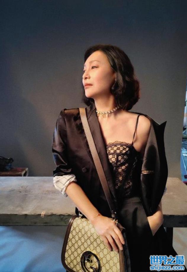 照片中惠英红一头黑色卷发,妆容清淡但精致,身上穿着黑色西装外套,内搭蕾丝吊带,露出半边香肩,胸前大片雪白的肌肤和精致的锁骨都十分的性感,脖颈处一丝细纹都没有,如果不说年龄的话,说30岁都有人信。