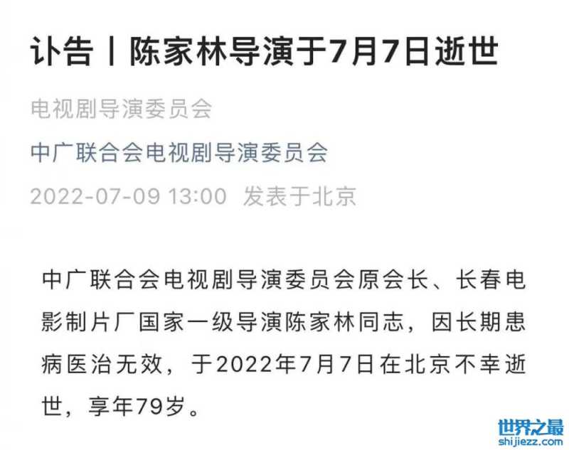 近日,据中广联合会电视剧导演委员会,国家一级导演陈家林,因长期患病医治无效,在2022年7月7日不幸在北京逝世,享年79岁。