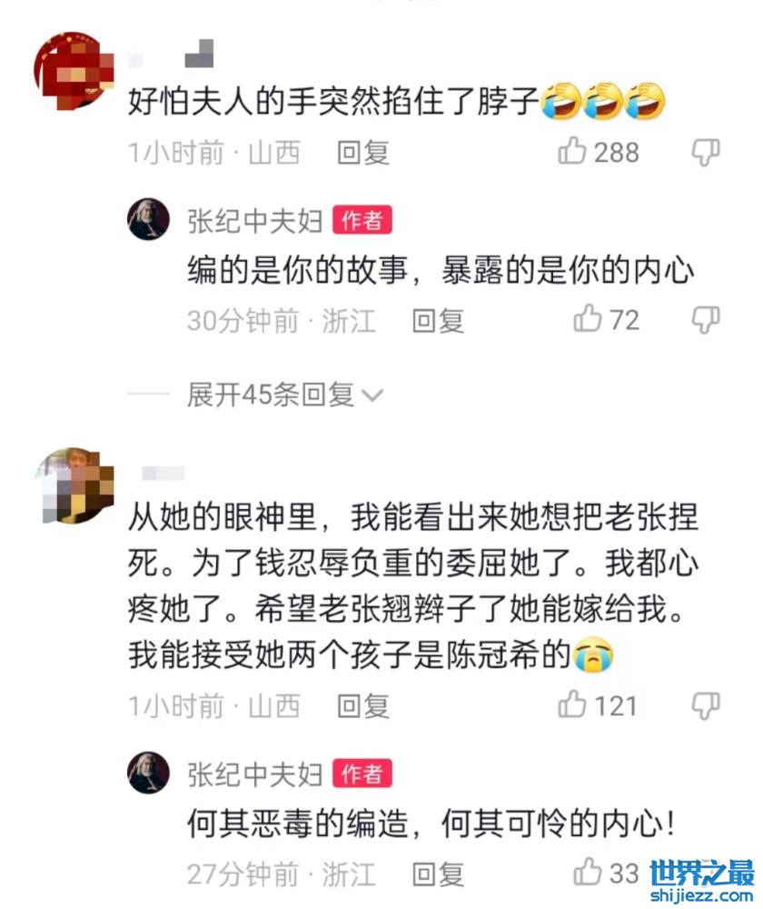 但视频下面却有网友发出不和谐的评论,有网友调侃说杜星霖的表情看起来想掐张纪中的脖子。还有网友评论杜星霖嫁给张纪中是为了“钱”而忍辱负重。张纪中回复网友是“何其恶毒的编造”。