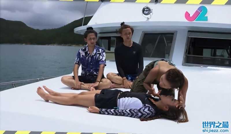 视频中,梁诺妍身穿一件绿色吊带背心,将头发箍起,准备为观众们展示救助溺水者的方法。在此刻节目效果还是以严肃为主,所有人都围绕着如何救援甲板上的“溺水同伴”展开工作。但当梁诺妍俯下身子,与同性友人嘴对嘴人工呼吸后,画风逐渐变得微妙起来。