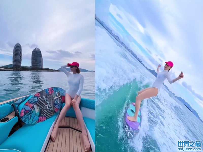 李彩桦穿连体泳衣冲浪,光脚踩板上大长腿惊人,泳装太湿透出内衣 ...