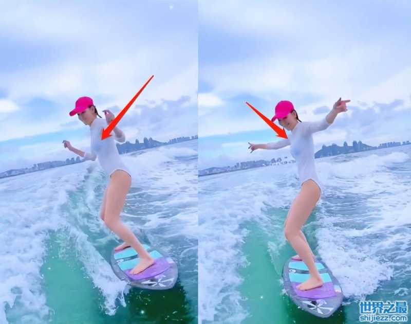 而在其冲浪过程中,可以看见李彩桦的平衡能力极好,能够自如地掌握浪潮,玩得分外开心和投入。不过也因为淋了水的原因,明显能够看到其白色内衣透视明显,略微有些尴尬。
