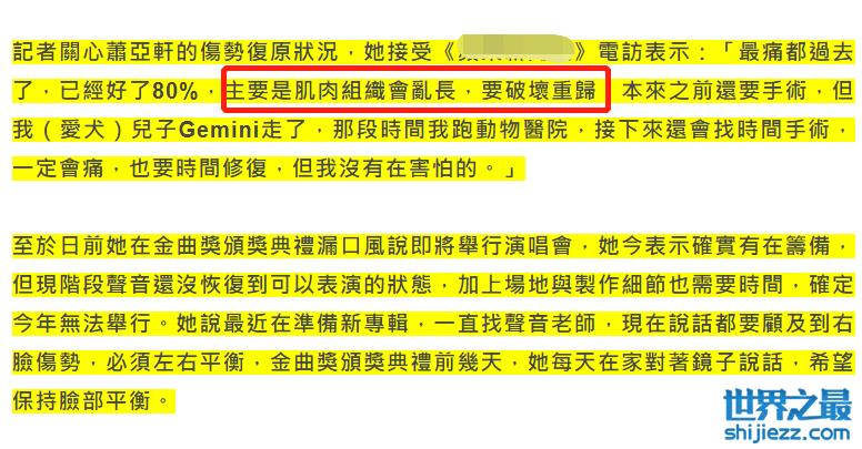 在台媒独家访问萧亚轩的报导中得知,其实萧亚轩的伤势基本已经康复,只是表皮的肌肉组织被破坏,未经医疗手术干预的情况下,肌肉组织会乱长,所以才会留下这些看起来稍显可怕的痕迹。