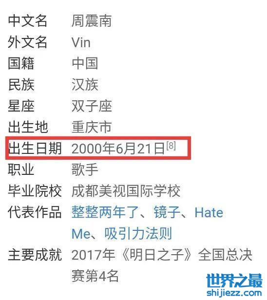 目前,周震南的网上资料显示,他于2000年出生,等于改一岁跨了一个时代,成为了00后艺人。