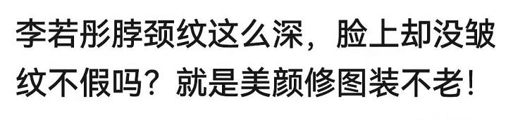 李若彤脸上的瑕疵已经尽力地在用粉底、遮瑕修饰了,但脖子上皮肤松弛、凹陷的痕迹却不容易掩盖。真是看脸30岁,看脖子50岁的典型写照。