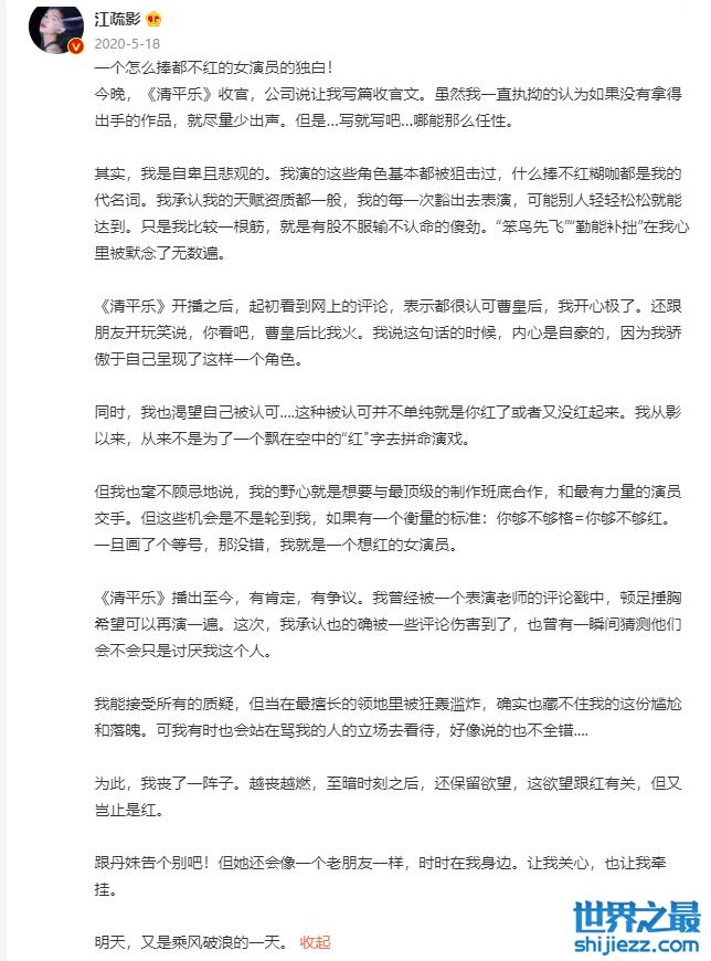 《清平乐》播完之后,江疏影发长文告别角色。长文提到她想红,想跟顶级的制作班底合作,但是看她这一路走来,难道没有和好的班底合作过吗?