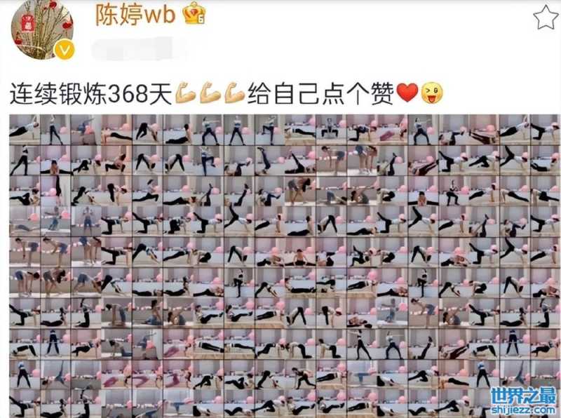 陈婷不仅喜欢户外运动,户内的健身运动也成为了她健康生活的一部分。此前陈婷就在个人社交平台上晒出了自己连续锻炼368天的拼图,从密密麻麻的小图里不难看出陈婷穿着紧身的瑜伽服,在瑜伽垫上解锁各种高难度的瑜伽姿势,368天的连续性不得不让人感慨她的毅力与坚持。