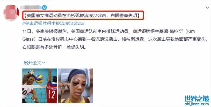 近日,多家美媒报道称,美国奥运队前室内排球运动员、奥运银牌得主基姆·格拉斯(Kim Glass)日前在洛杉矶市中心遭到一名流浪汉袭击,右眼差点失明,目前流浪汉已被警方控制。事情一经曝出,便引起了广大网友的密切关注。