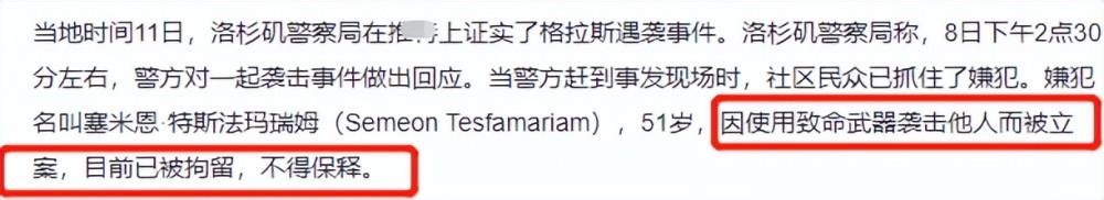 根据事后报道,袭击格拉斯的嫌犯也被社群民众立马控制住了。此嫌犯因使用致命武器袭击他人而被立案,目前已被拘留,不得保释。