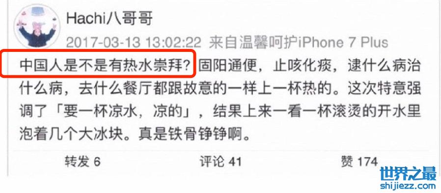 她先是说,“中国人是不是有什么热水崇拜”,其实就是她去餐厅吃饭,服务员给了她一杯加冰块的热水,她就在阴阳怪气地吐槽。