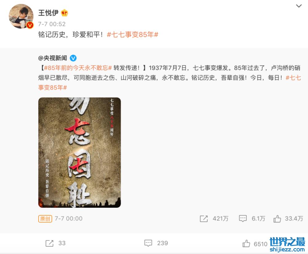 2017年王悦伊进入娱乐圈后,她似乎就有了艺人的自觉,不再发布这些言论,并且还会在公祭日时转发官方微博。但她想的跟做的是不是一致呢?无从得知。