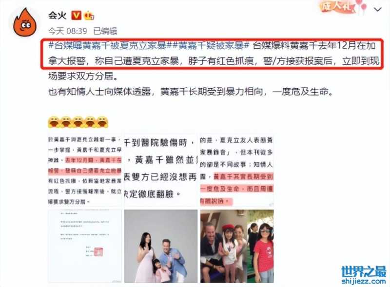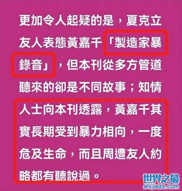 近日,有台媒曝出黄嘉千与夏克立更多离婚内幕,直指夏克立婚内家暴黄嘉千,掐黄嘉千脖子致使其报警,随后黄嘉千友人更是曝出夏克立长期家暴的说法,在节目里温柔和善的夏克立被传出家暴这也让广大网友大跌眼镜,引发他们的热烈讨论。