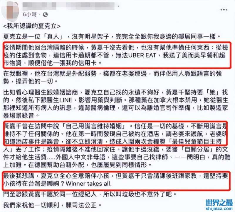 这几天双方因为离婚在网上都掀起了舆论大战,此前夏克立好友曾在社交平台上发文指控黄嘉千“五大罪状”,包括不照顾小孩,不帮忙澄清绯闻等,还称黄嘉千很早就为离婚官司做准备。