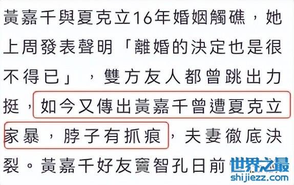 据悉,黄嘉千是去年遭受夏克立家暴,脖子有红色抓痕,她还去医院验伤被医生检查判定认为,黄嘉千并无明显外伤。从此两人彻底决裂,没再想当假面夫妻。